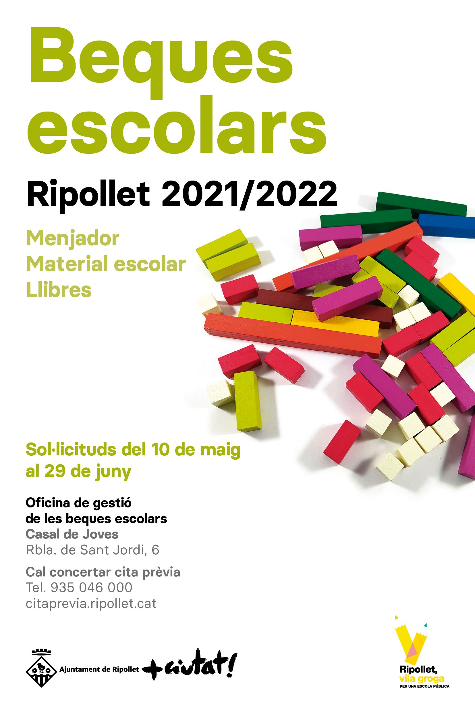 Les sol·licituds de beques escolars de menjador i de llibres i material escolar per al curs 2021-2022 es poden tramitar fins el 29 de juny. Poden optar-hi les famílies dels alumnes empadronats a Ripollet que cursin de P3 a 4t d’ESO en un centre educatiu del Vallès Occidental. La presentació de sol·licituds es realitzarà de forma telemàtica (a través d’una instància genèrica a la Seu electrònica, amb certificat digital) o presencial, amb cita prèvia. L’oficina provisional de l’OAC per a la campanya de beques escolars de l’Ajuntament de Ripollet, ubicada extraordinàriament a la Rbla. de Sant Jordi, 4 (Casal de Joves). En aquest cas, és obligatori demanar cita prèvia de forma telemàtica o per telèfon, al 935 046 00.- RAD