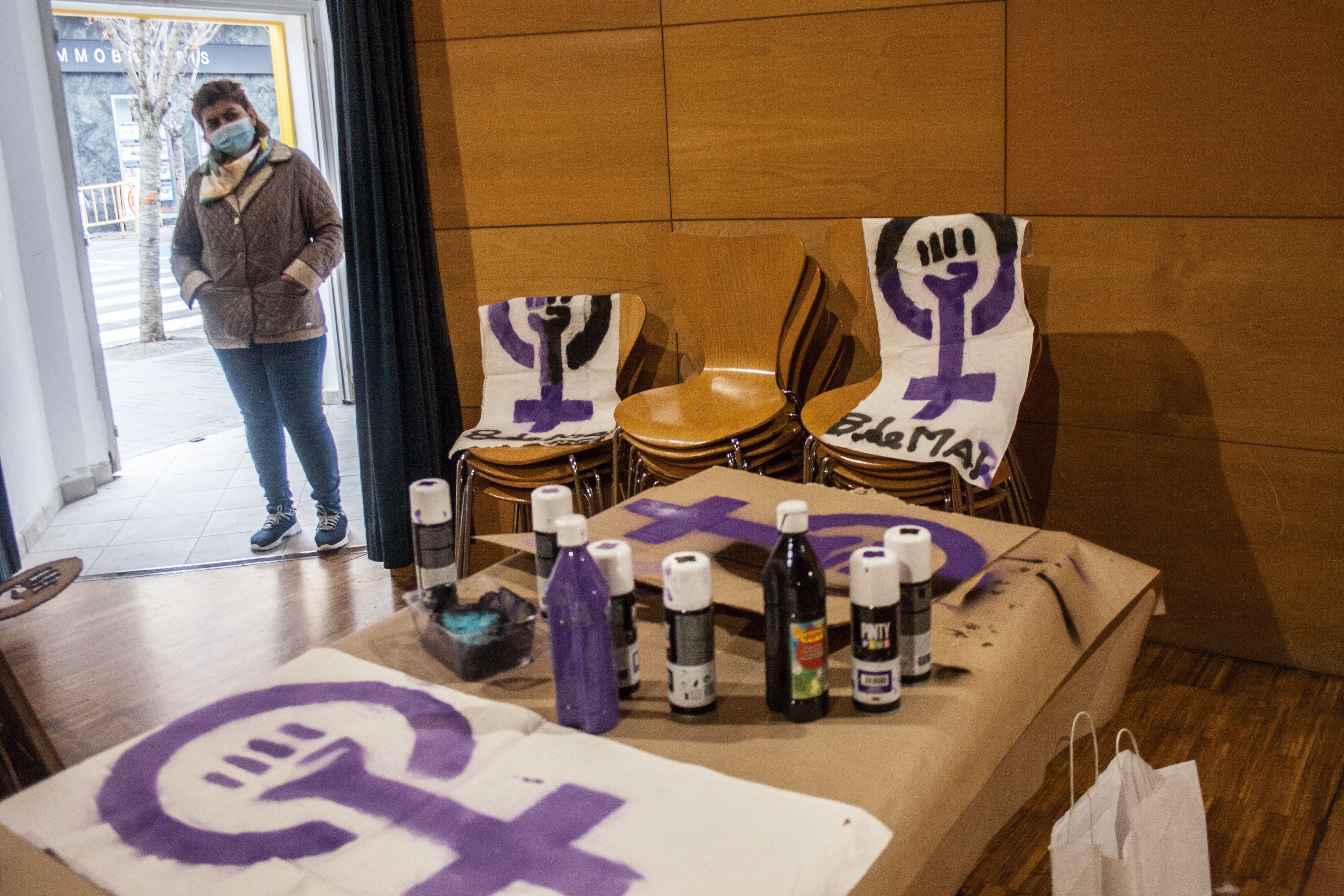 “Amb el covid hem aprés a improvisar”, ironitzava una de les organitzadores. La marxa esportiva amb la que s’inaugurava el programa es va canviar per una caminada simbòlica de la plaça del pavelló al Centre Cultural, on finalment va congregar-se la trobada prevista. Infusions i cafès enlloc de vermut, taller de ioga per reconnectar amb el propi poder i l’imprescindible trivial feminista amb preguntes sobre referents històrics del feminisme, dissidències corporals o teoria feminista. Aprendre entre rialles. Qui treia el cap per la porta d’emergència del Centre Cultural, automàticament era convidada a un té. “Totes les que han vingut, s’han implicat de valent”, destacava una de les dones del Comitè. Es distingien de la resta de dones que passaven pel Centre Cultural, perquè, a banda de les bandades, mocadors, samarretes, bosses o mascaretes liles, les del Comitè portaven un llaç blanc de rebuig a la guerra.