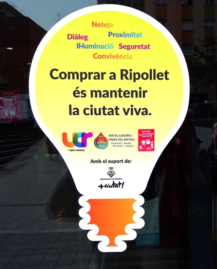Pensa-hi. Comprar a Ripollet és mantenir la ciutat viva. El lema imprec en 180 adhesius que reprodueixen la forma d’una bombeta clàssica apeŀla a la responsabilitat dels compradors a l’hora de planificar les seves compres. “Volem fer poble, sense el comerç la Rambla estaria trista, no seria res. El comerç és vida”, exclamava dimarts Maricel Palau, de l’Associació de comerciants i venedors del Mercat, en la presentació de la campanya, la segona que impulsen conjuntament la Unió de Comerciants de Ripollet, el Mercat Municipal i el gremi dels instaŀladors i pimes del metall.